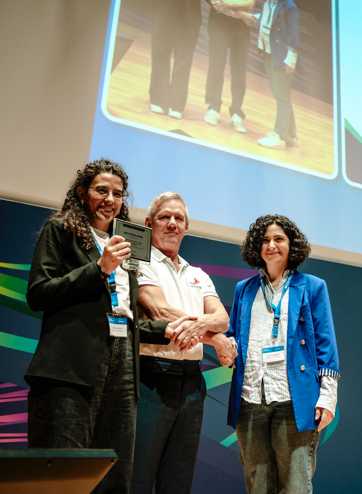 Matteo Agliuzza receiving a Best Paper award onstage.